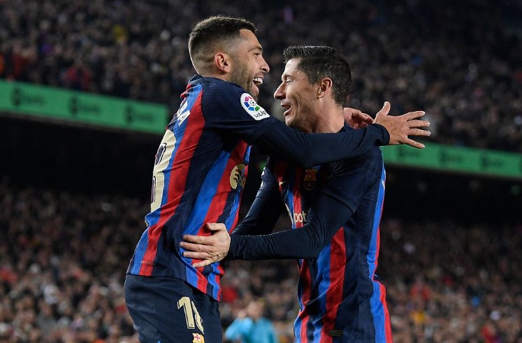 足球新闻:巴塞罗那后卫乔迪·阿尔巴(左)在打进球队对阵塞维利亚的首个进球后与罗伯特·莱万多夫斯基一起庆祝。