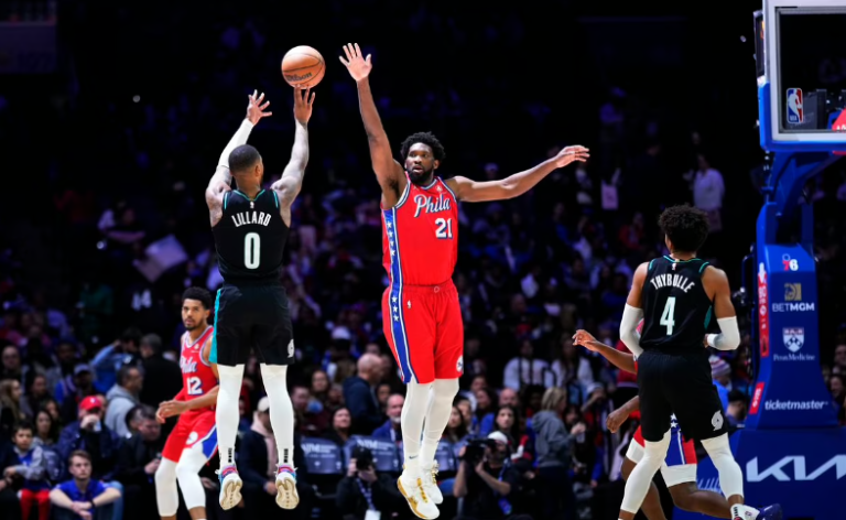 体育新闻:费城 76 人队的乔尔·恩比德在对阵波特兰开拓者队的比赛中得分。