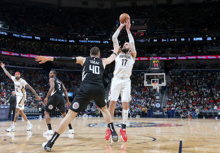 吉祥坊新奥尔良鹈鹕队的乔纳斯瓦兰丘纳斯在对阵洛杉矶快船队的比赛中投篮。
