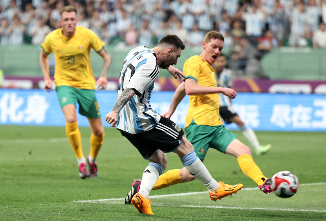 阿根廷队的莱昂内尔·梅西在与澳大利亚队的友谊赛中进球。
