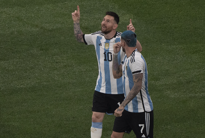 阿根廷队的莱昂内尔·梅西在与澳大利亚队的友谊赛中庆祝进球